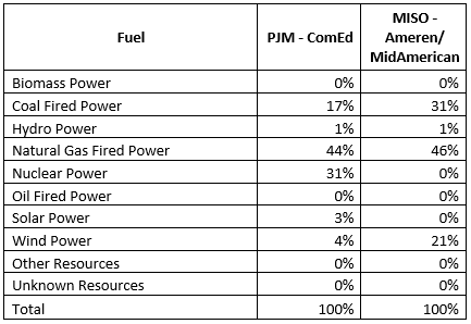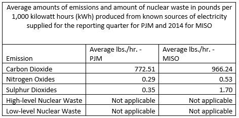 The average nitrogen oxide, sulfur dioxide, and carbon dioxide emissions for PJM and MISO are approximate benchmark emission levels for all electricity generation in those regions. Data used to calculate the emission profile came from PJM-EIS and Ameren-EIA.gov. Carbon dioxide is “greenhouse gas” which may contribute to global climate change. Nitrogen oxide and sulfur dioxide released into the atmosphere react to form acid rain. Nitrogen oxide also reacts to form ground level ozone, an unhealthful component of “smog”.