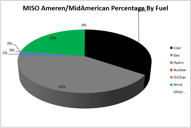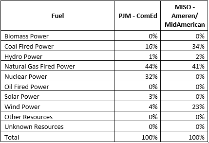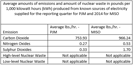 The average nitrogen oxide, sulfur dioxide, and carbon dioxide emissions for PJM and MISO are approximate benchmark emission levels for all electricity generation in those regions. Data used to calculate the emission profile came from PJM-EIS and Ameren-EIA.gov. Carbon dioxide is “greenhouse gas” which may contribute to global climate change. Nitrogen oxide and sulfur dioxide released into the atmosphere react to form acid rain. Nitrogen oxide also reacts to form ground level ozone, an unhealthful component of “smog”.