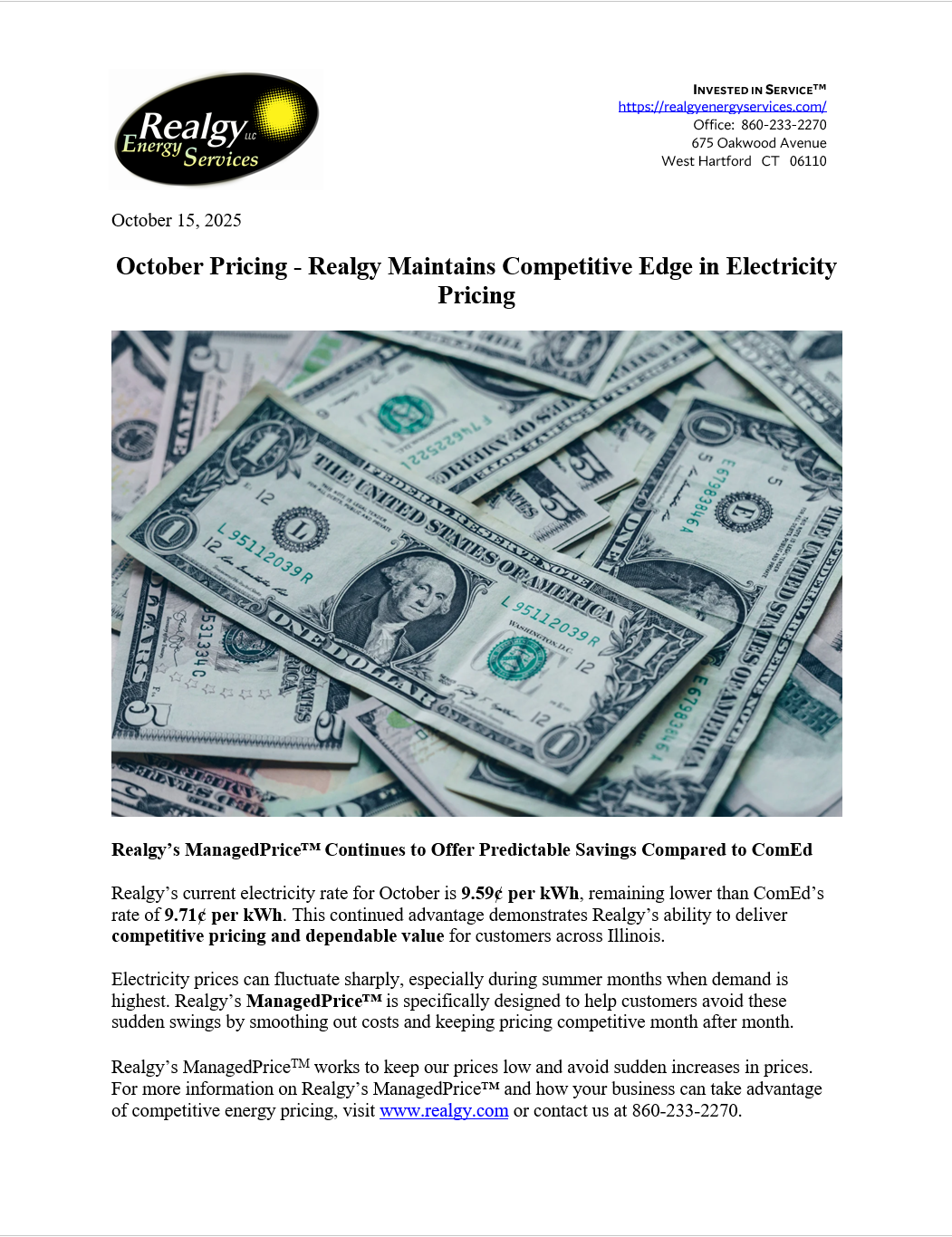 October Pricing – Realgy Maintains Competitive Edge in Electricity Pricing posted by: Realgy Energy Services October 15, 2025 No Comments